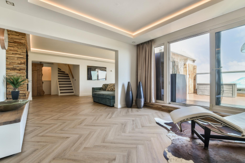 The living room enjoys plenty of natural light thanks to the large number of windows. The open-plan kitchen is practically designed and equipped with a refrigerator, freezer, dishwasher, combi oven, 4-burner induction hob and enoughstorage space.